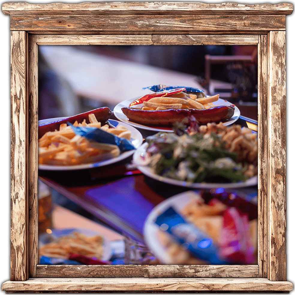 Drie originele Neurenbergse braadworsten, goudbruin gegrild, op een bedje van stevige zuurkool en romige aardappelpuree – een feest voor het gehemelte! - Krokante Wiesn kip met goudbruine frietjes